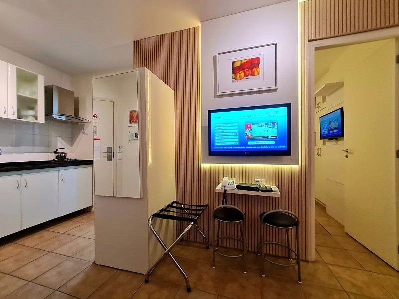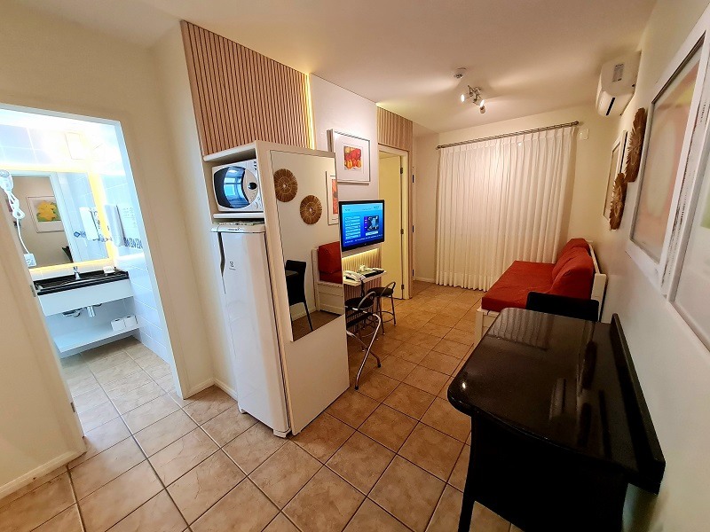 Nossos apartamentos, disponíveis em três configurações, são perfeitamente equipados com mini cozinha, sacada e TVs LED de 32 polegadas, atendendo às necessidades de famílias de diversos tamanhos.